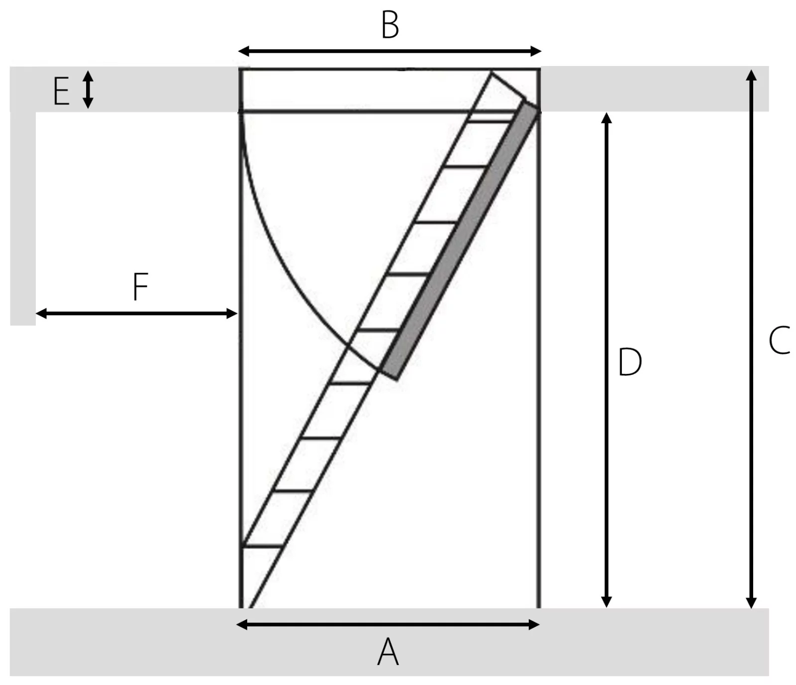 - Ausklappraum (F): Bei Dachbodentreppen ist zu beachten, dass diese in der Regel einen gewissen Platz zum Ausklappen benötigen. Diesen über das Grundmaß hinausgehenden Bereich bezeichnet man als Ausklappraum.