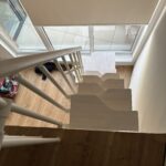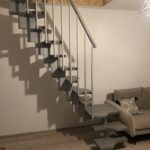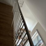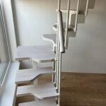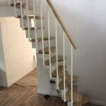 Optimalizované prostorově úsporné schodiště s trojúhelníkovými stupni, se sloupkovým zábradlím a dřevěným zábradlím