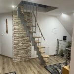- Nápadné kovové části v kombinaci s jemně zakřivenými dřevěnými schody