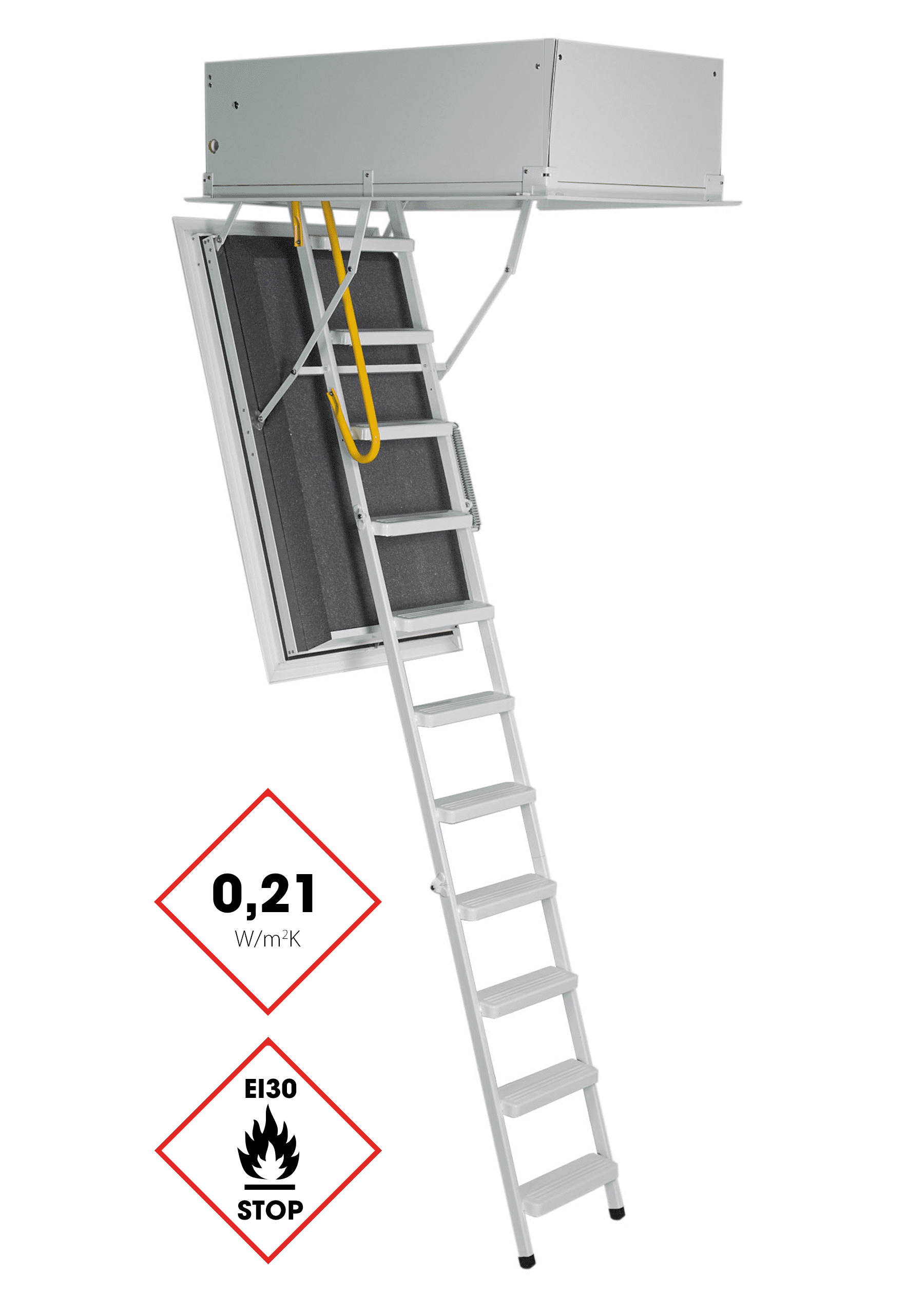 The Arctic Fire attic staircase from Minka is the perfect combination of insulation and fire retardancy. With a U-value of 0.21 W/m2K without top cover and 0.14 W/m2K with ISO top cover, it plays in the top league of insulation technology. According to ÖNORM EN1363 and EN1634, the Arctic Fire Loft Staircase is fire-retardant EI230 and thus has a fire resistance value of at least 30 minutes.
