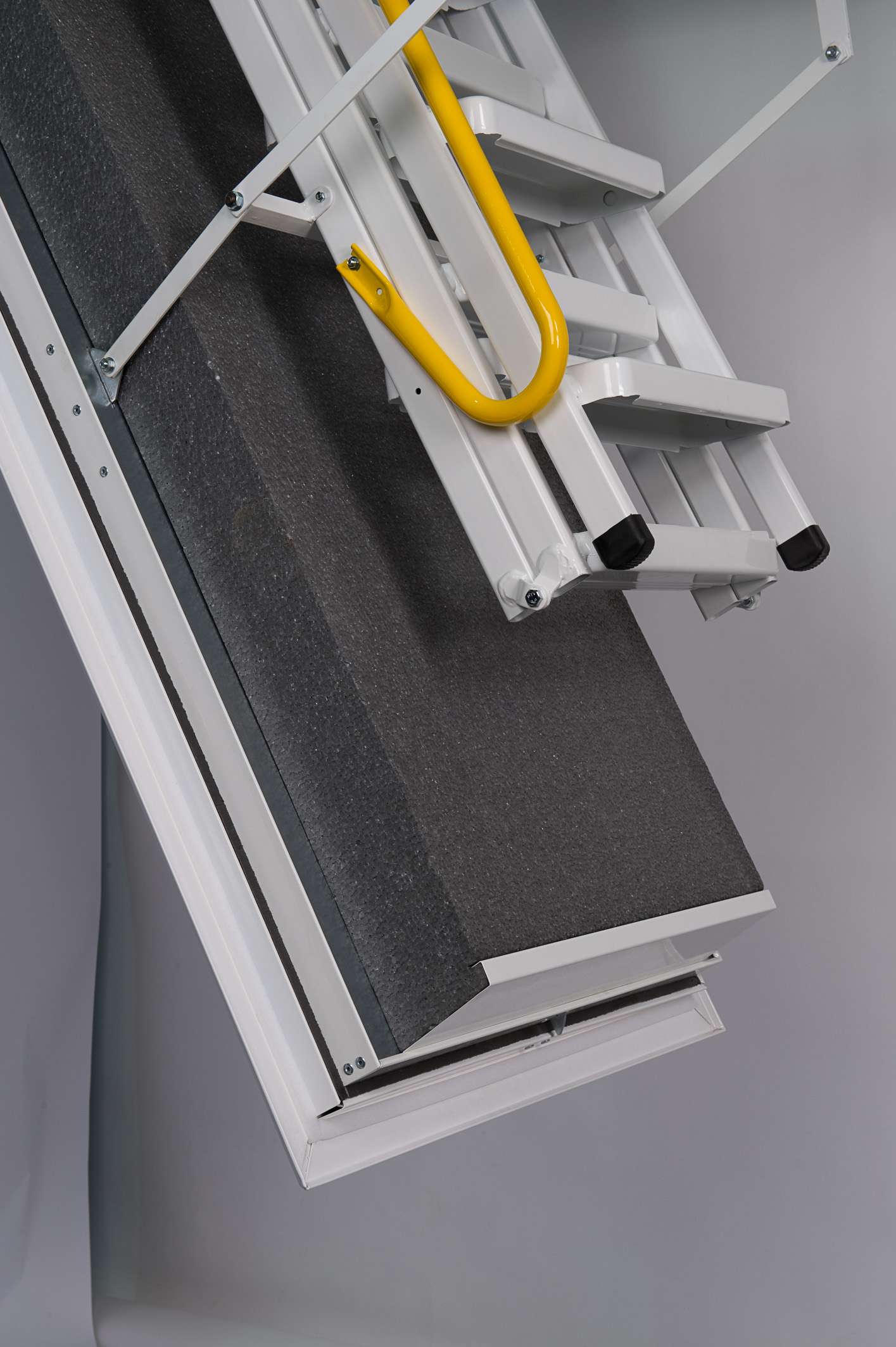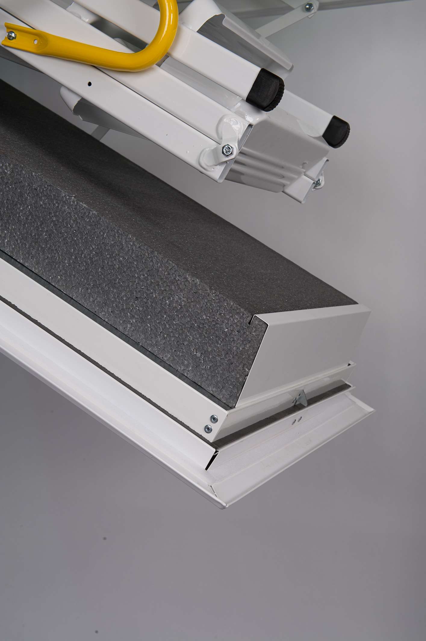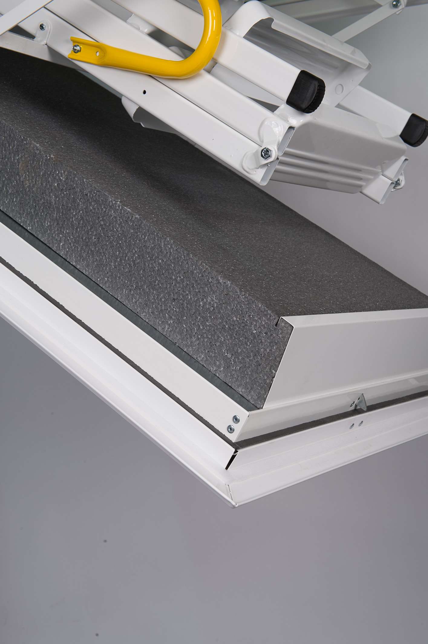 The Arctic Fire loft staircase is available in five different sizes, which means that it fits into ceiling openings with the following dimensions: 110×70 cm, 120×60 cm, 120×70 cm, 130×70 cm and 140×70 cm. Depending on the size, it is suitable for a room height of up to 300 cm, but can be shortened as needed. Thanks to the design lower lid, the Arctic Fire is also characterised by a seamless and particularly beautiful soffit. Like the stairs, this is kept in white, which makes the staircase look discreet but also elegant.