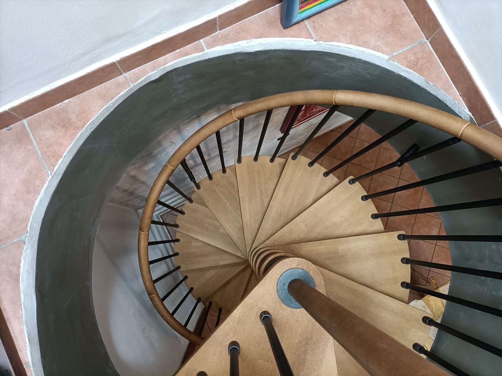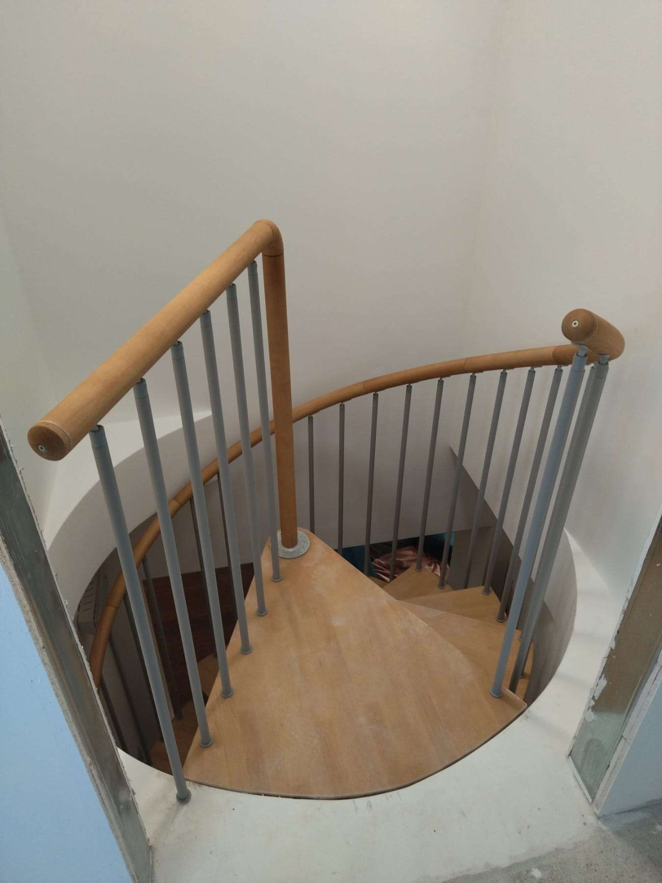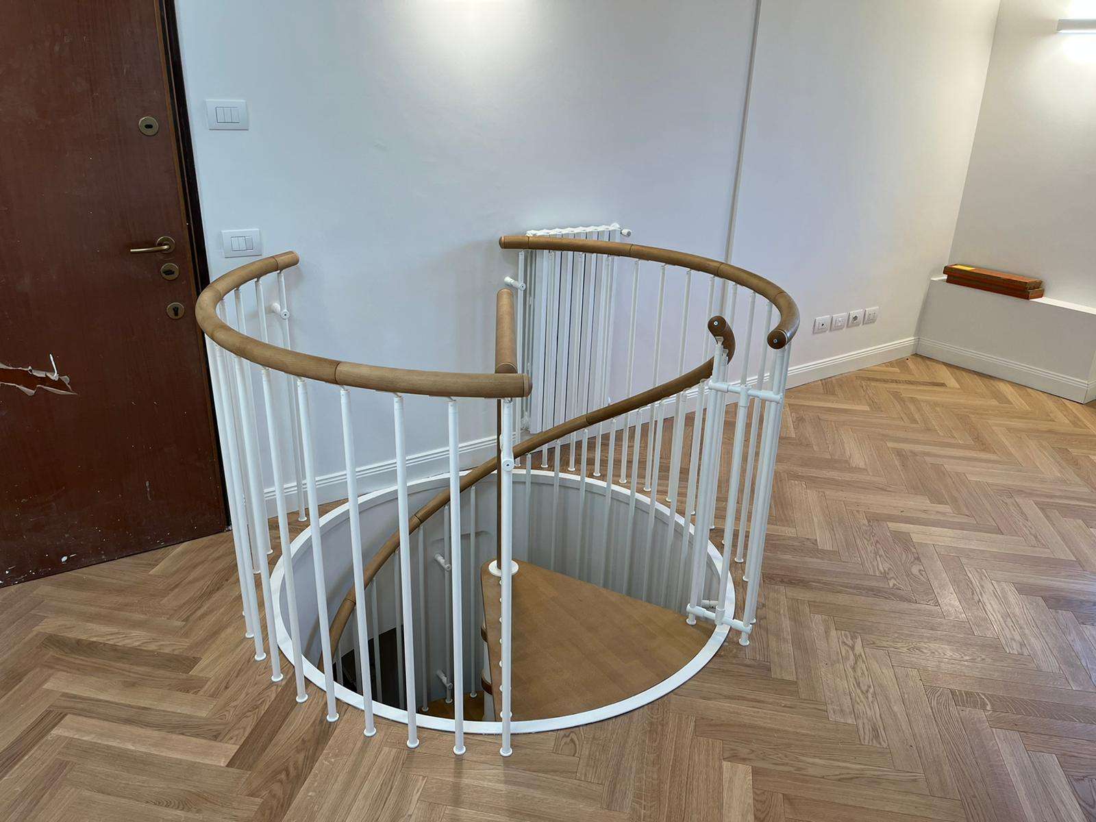 Das Geländer Modell R2 besteht aus Stahlrohrstäben Ø20, die mit speziellen Nylon-Elementen an Basis und Abschluss verbunden sind. Der Handlauf ist wahlweise aus formbarem Kunststoff, der sich flexibel an die Krümmung anpasst, oder aus segmentiertem Buchenholz, das individuell auf die Neigung der Treppe zugeschnitten werden kann.