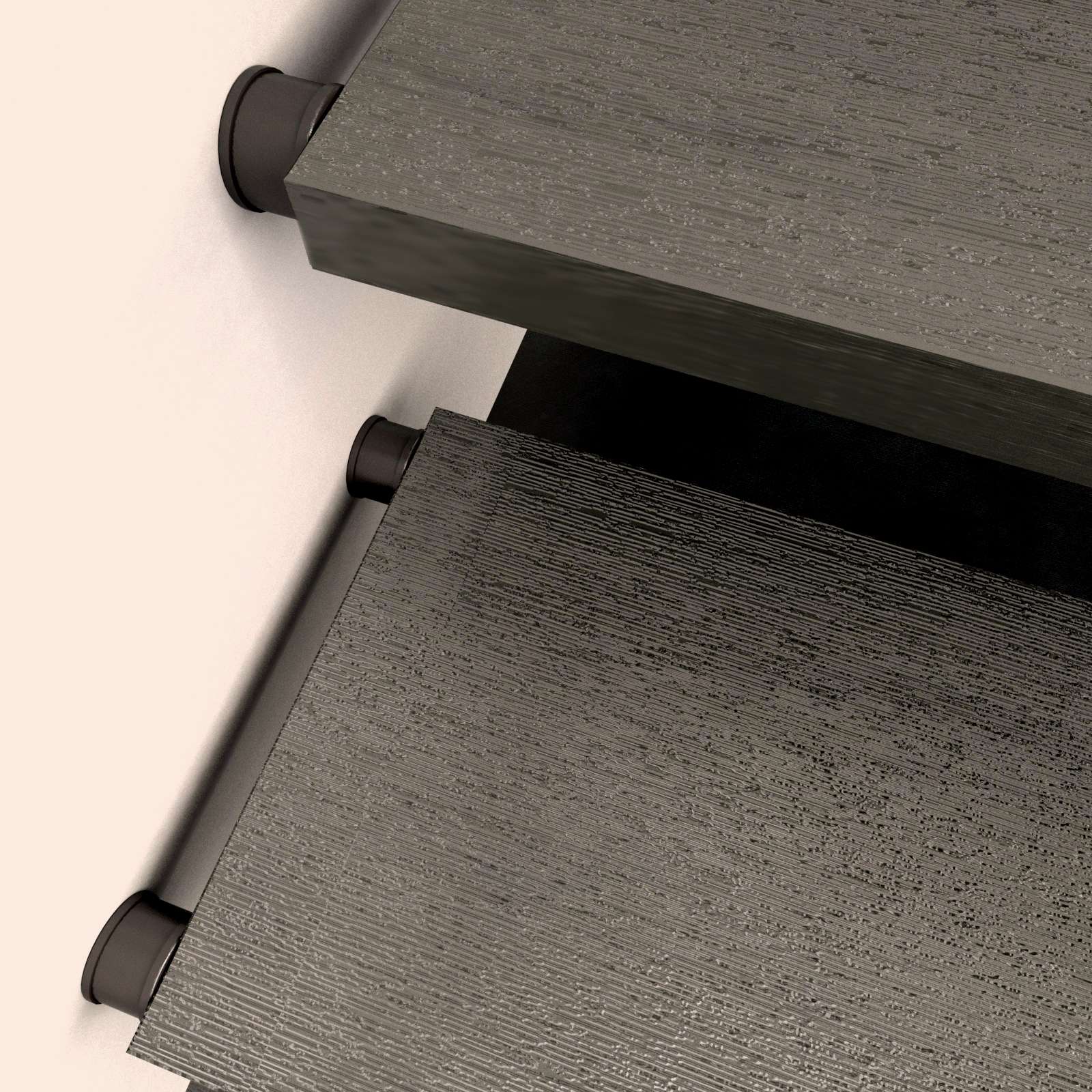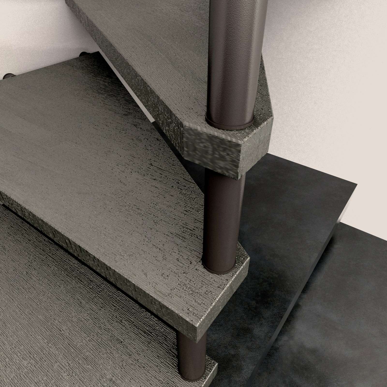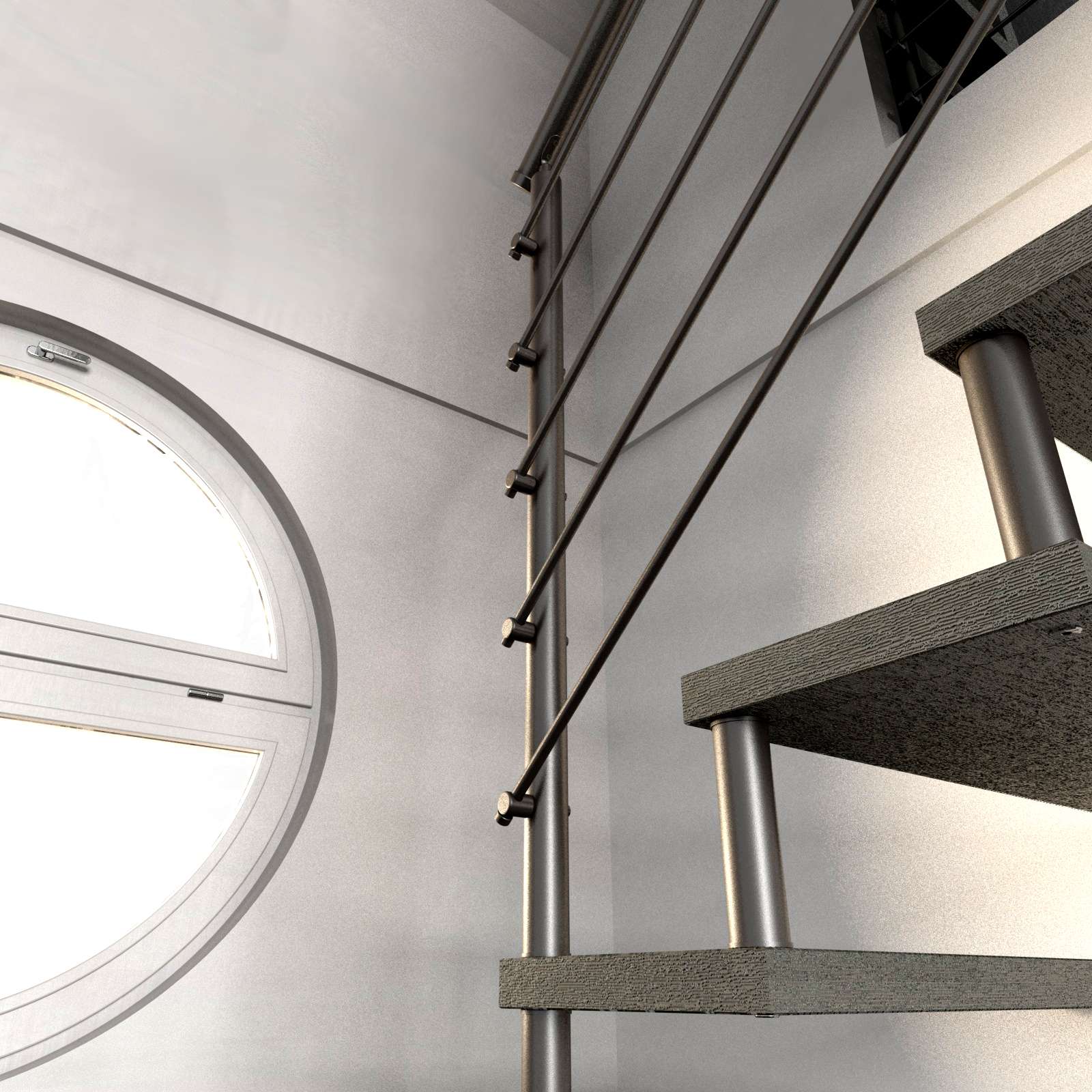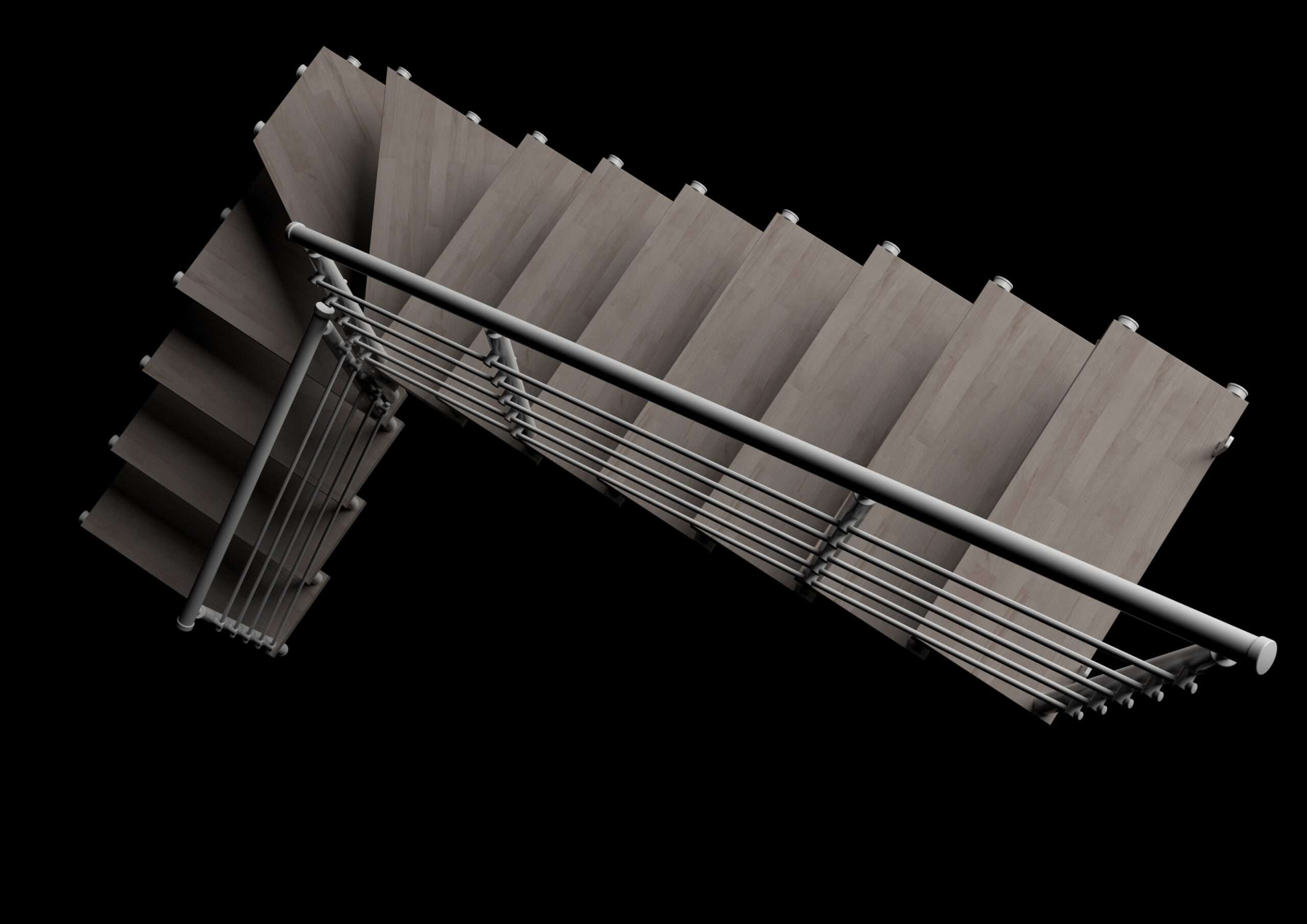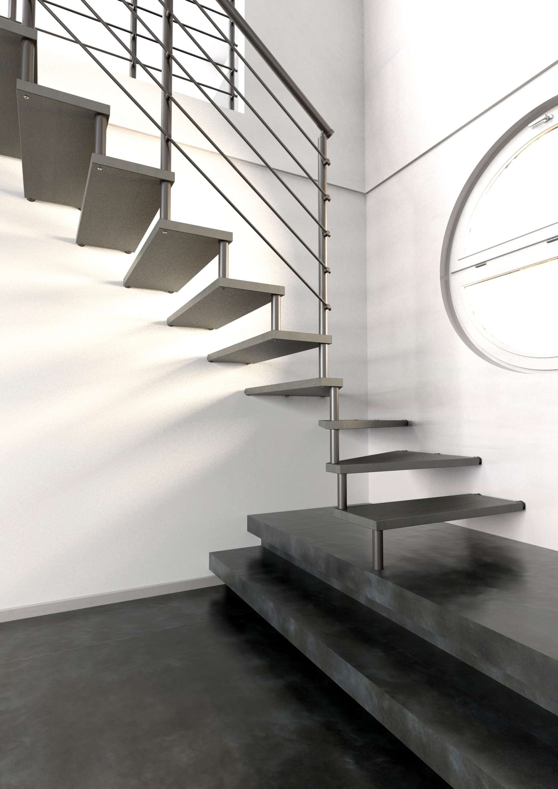 Komponiert direkt von den Außenwänden des Treppenlochs, an denen jede einzelne Stufe der Treppe durch die betreffenden Bolzen und metallische Abstandsstücke festgemacht wird.