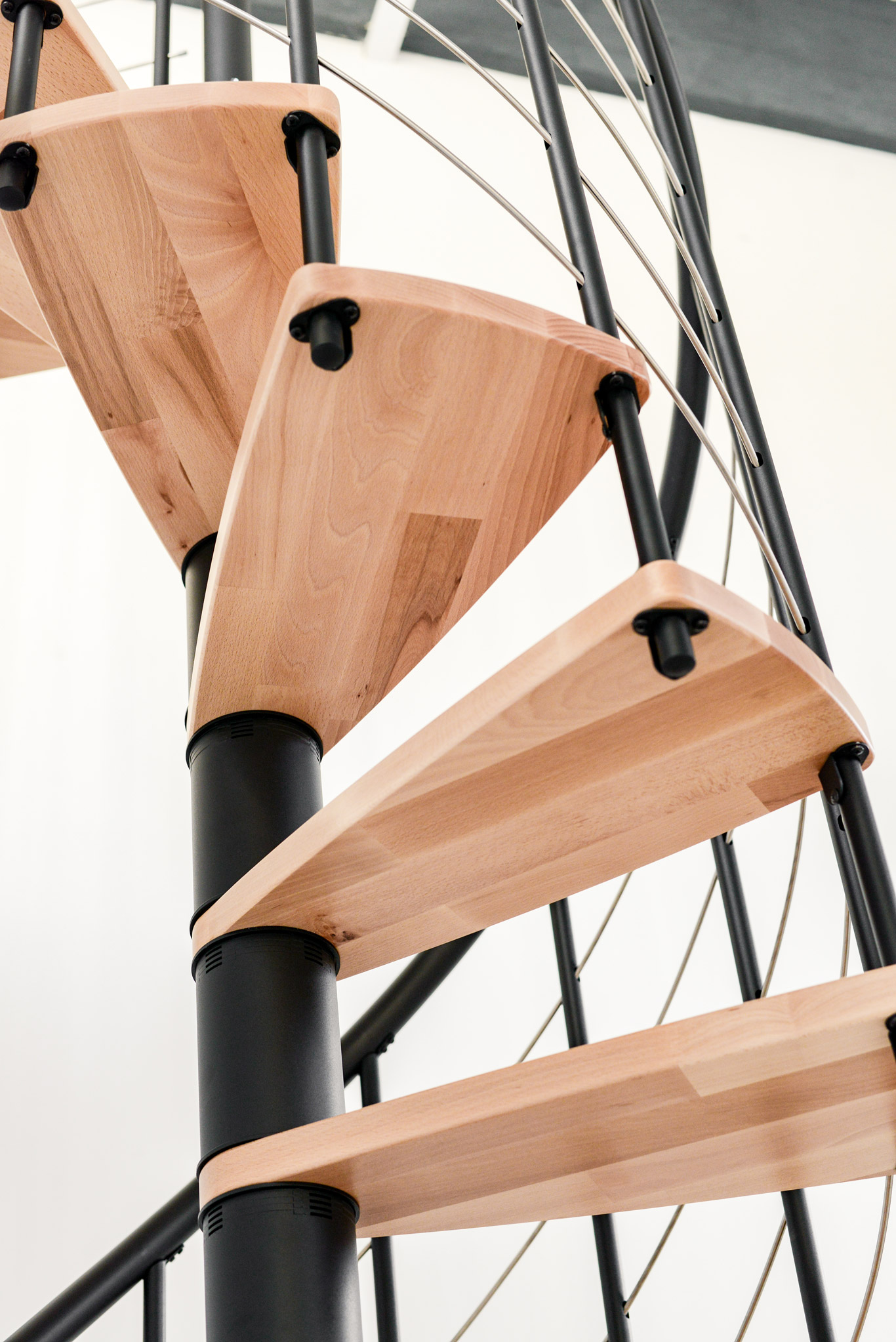 A Venezia csigalépcső a fafajok különösen nagy választékát kínálja. A lépcsőkhöz és a korláthoz bükk, dió, tölgy és fehér közül választhat, hogy megtalálja a lakberendezéséhez tökéletesen illeszkedőt. A fém alkatrészek porszórt bevonattal vannak ellátva fekete, szürke vagy fehér színben, az Ön ízlése szerint. Méretét tekintve a Venezia 120, 140 vagy 160 cm átmérőjű lehetőségek széles skáláját kínálja.
