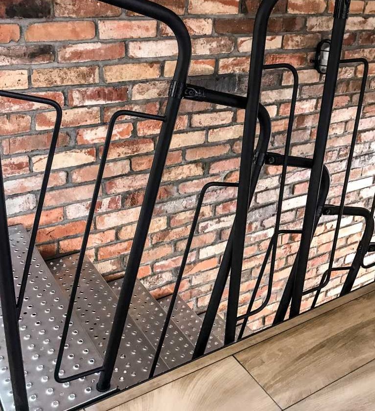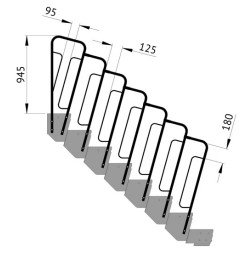 Die Konstruktion besteht aus Pfosten mit vertikaler Füllung, die im oberen Bereich in Richtung Handlauf gebogen sind