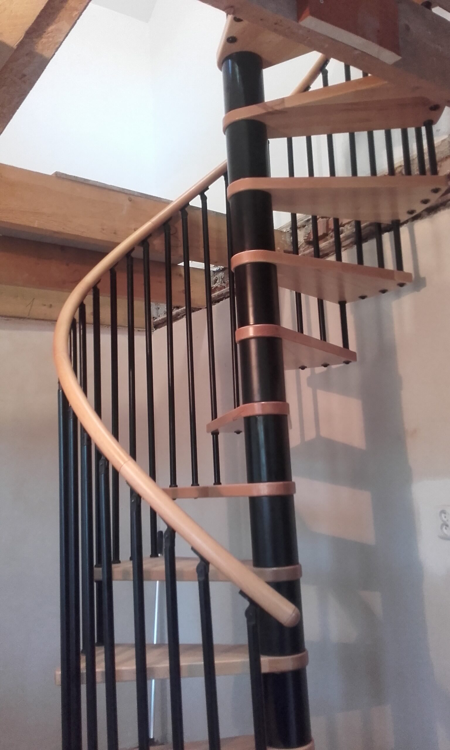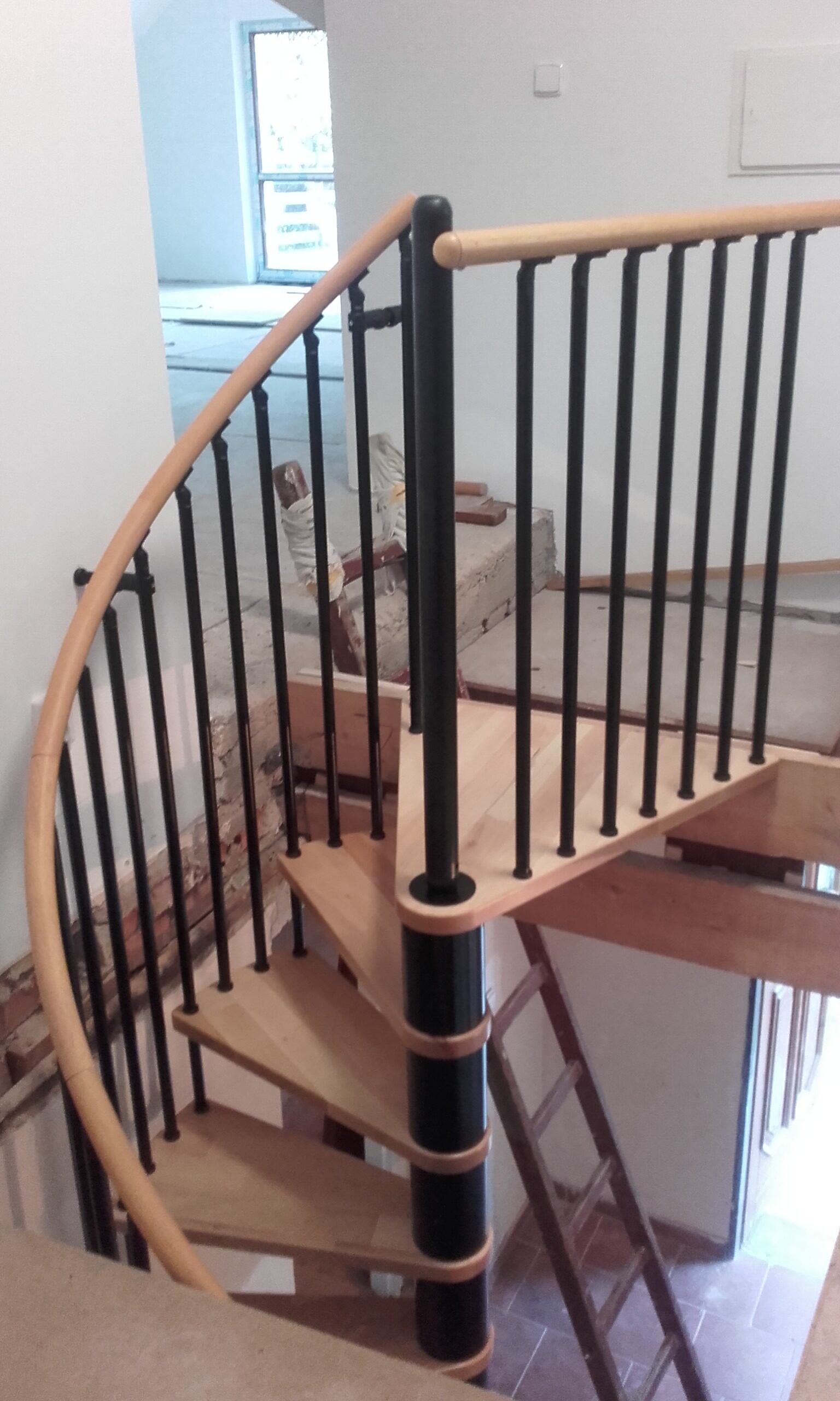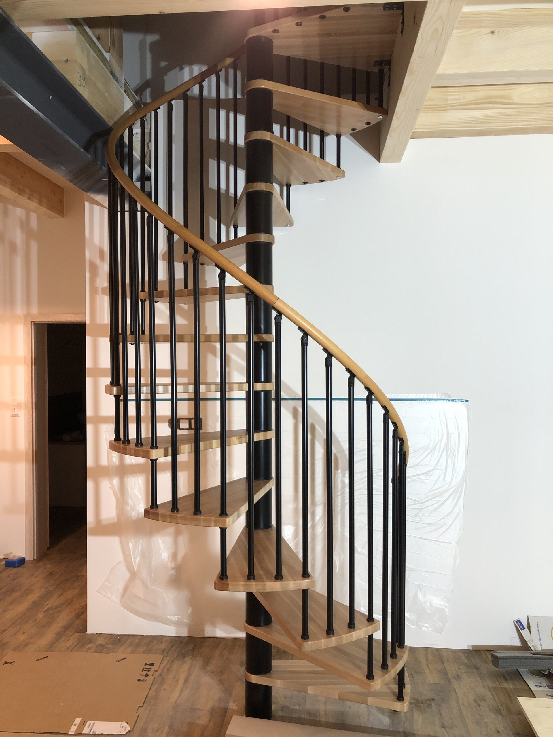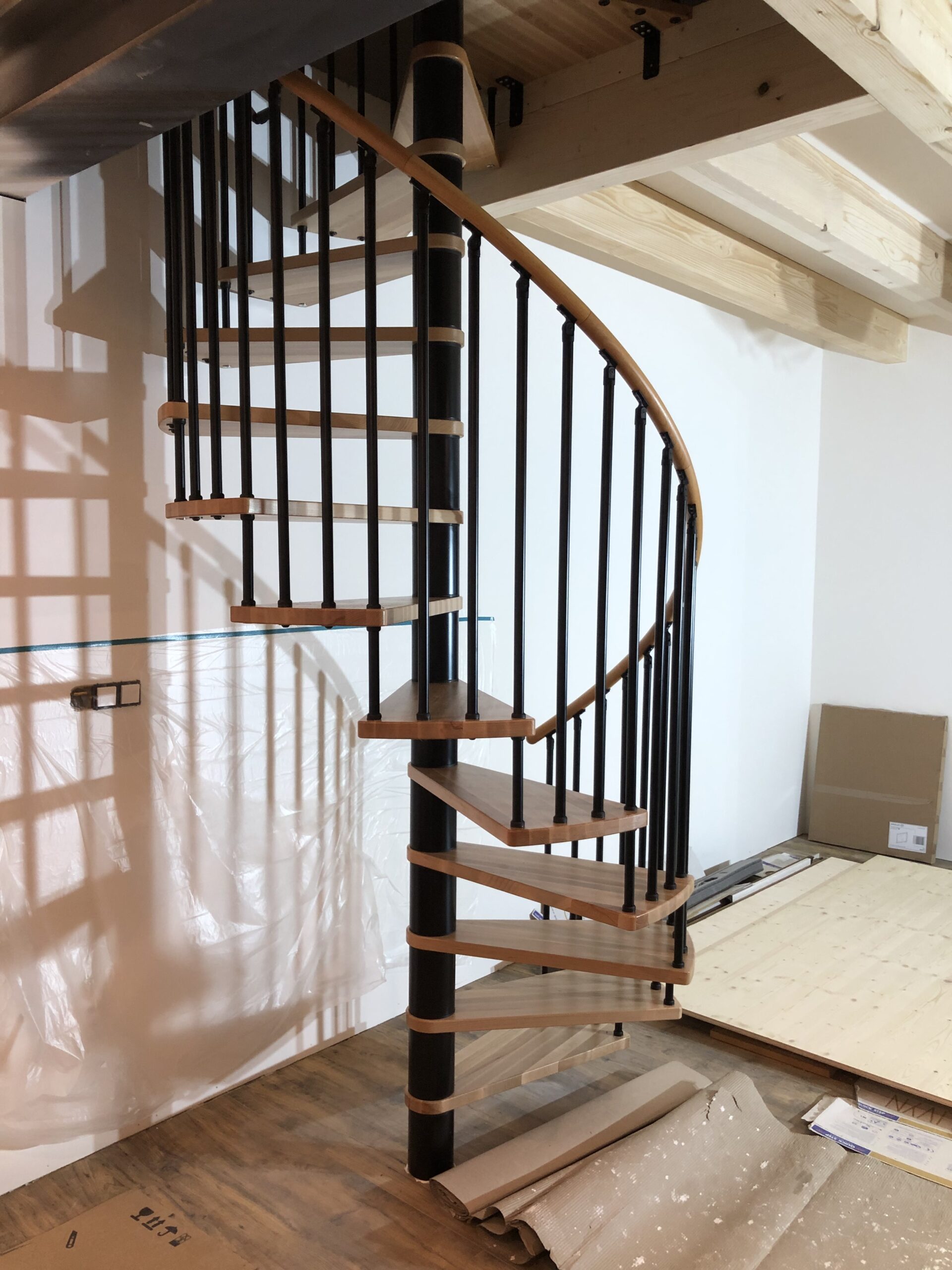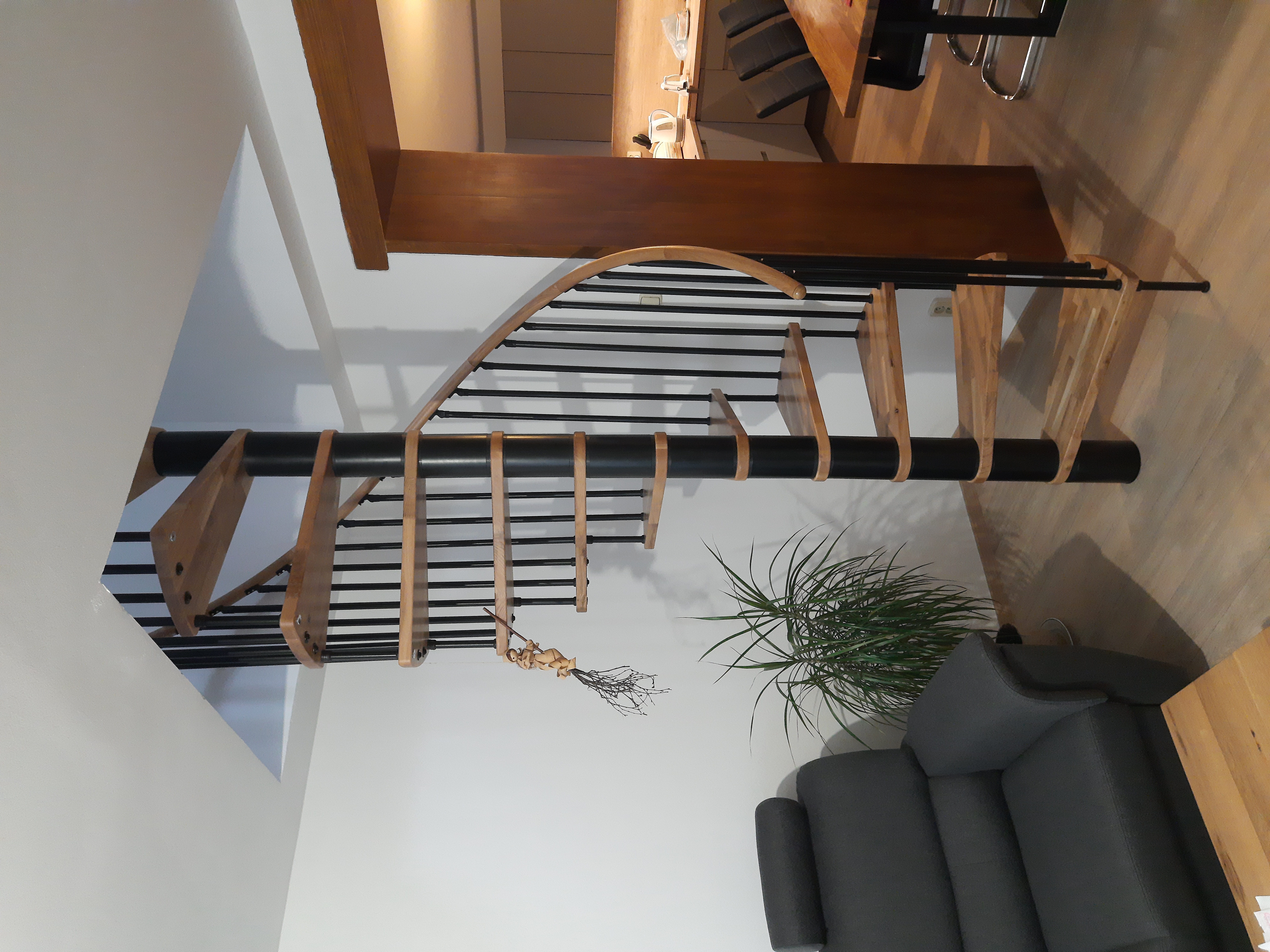 - Stabile Spindeltreppe mit Stufen und Handlauf aus lackiertem Massivholz