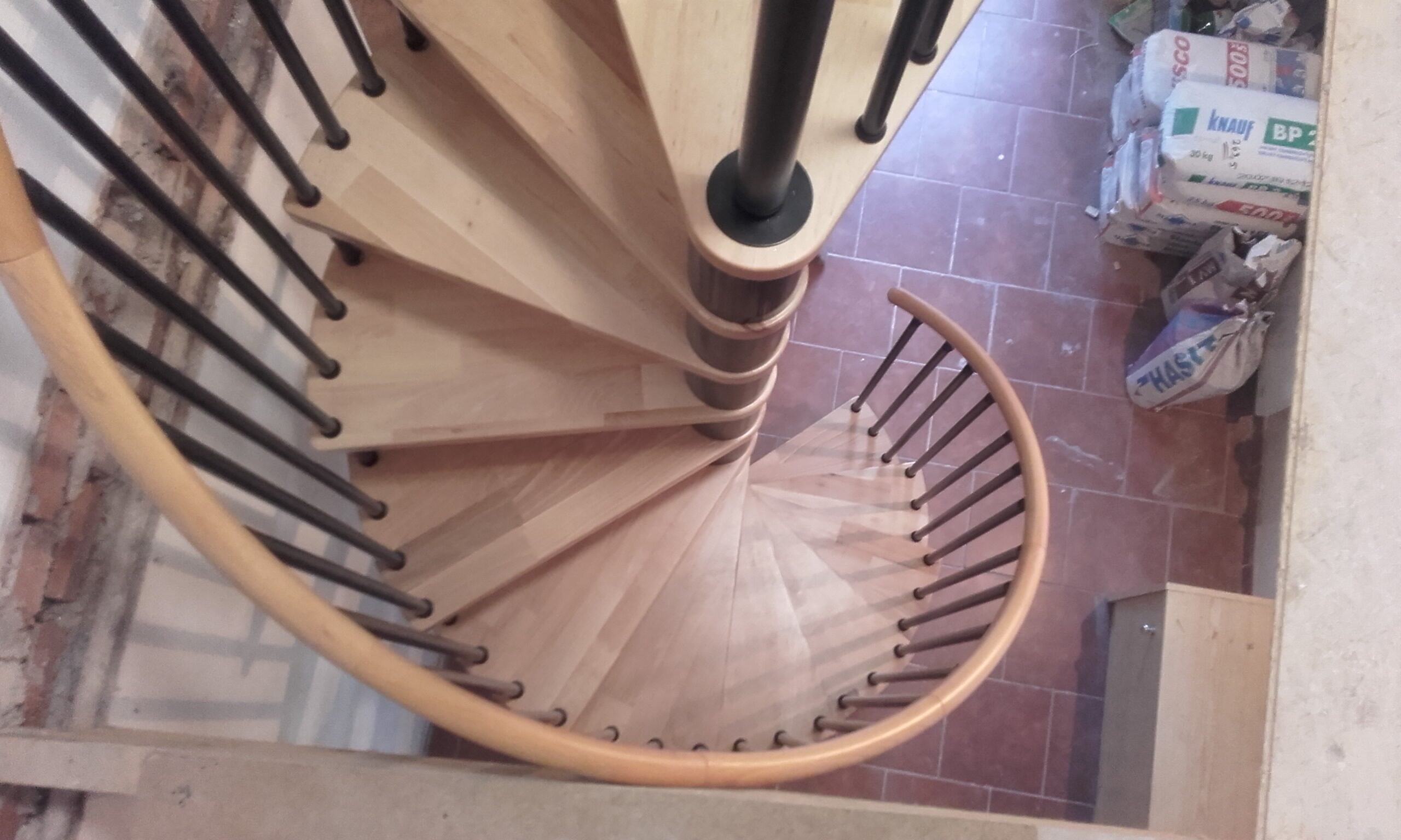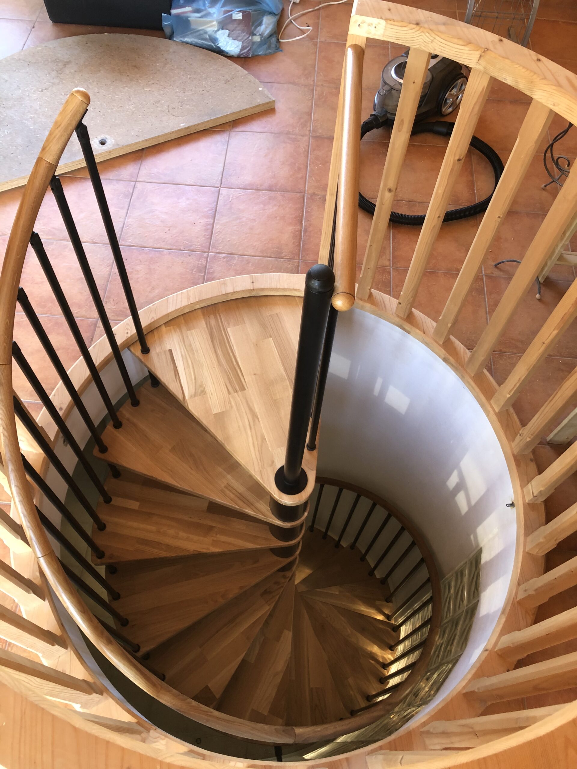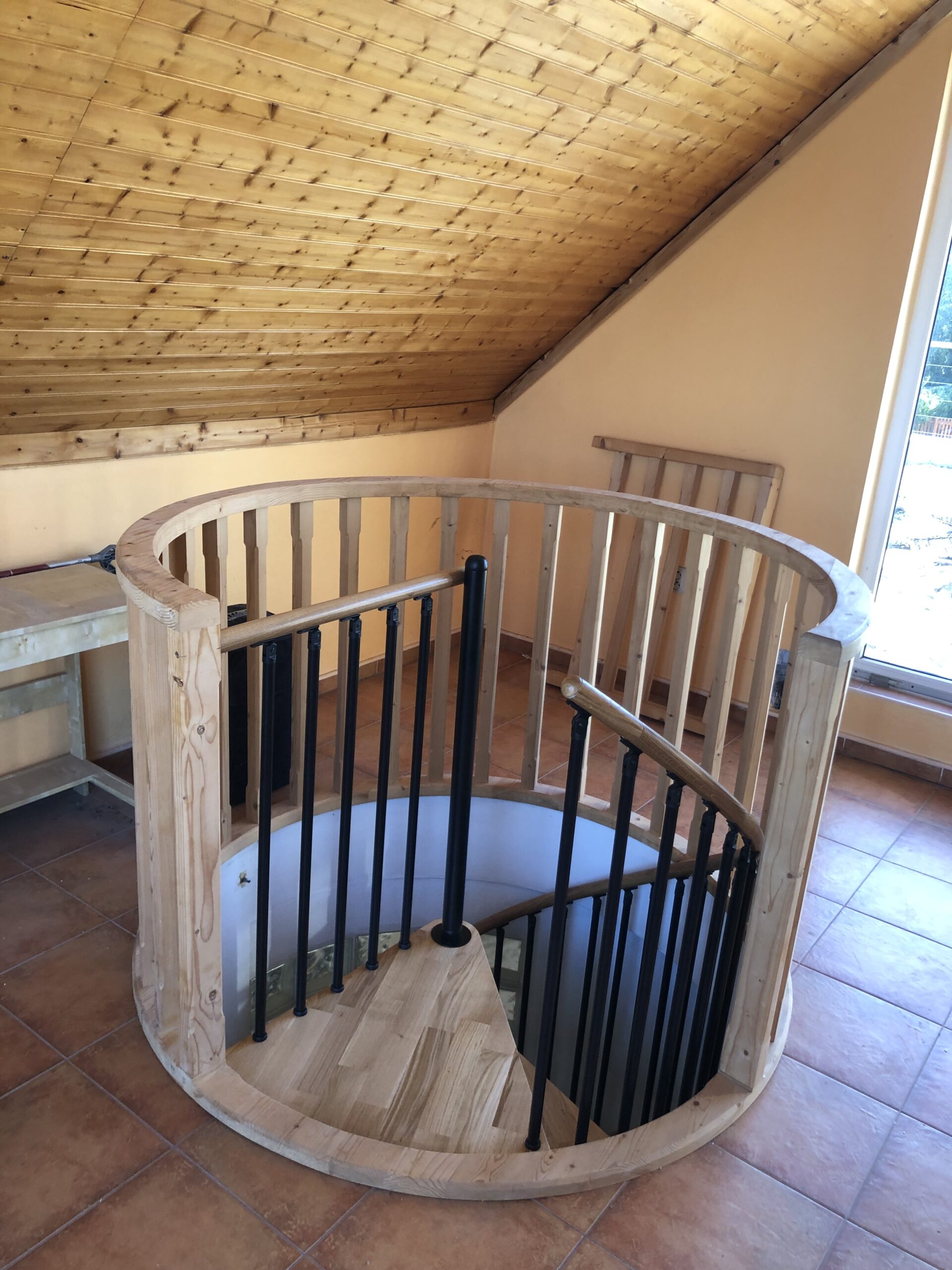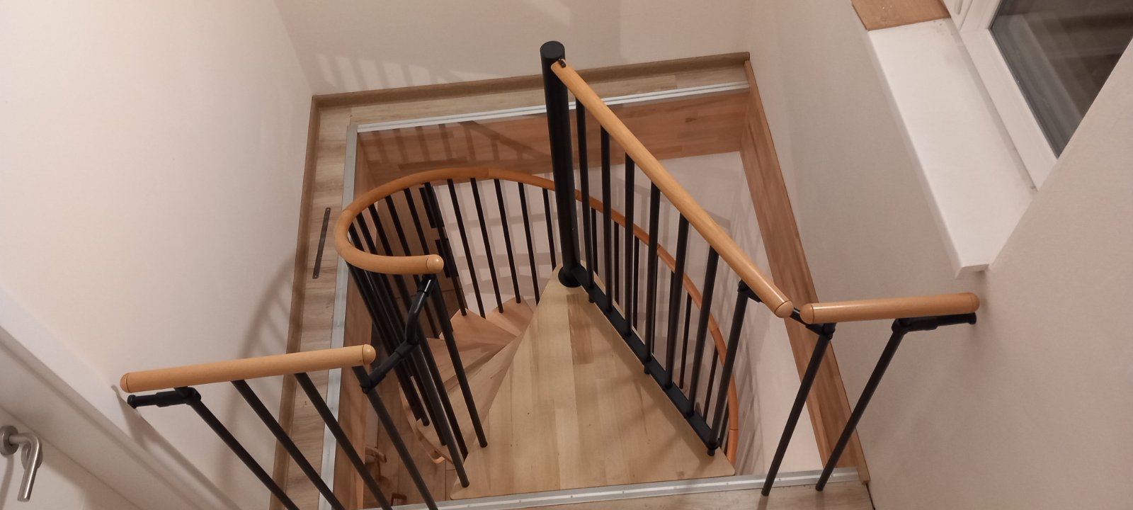 - Stabile Spindeltreppe mit Stufen und Handlauf aus lackiertem Massivholz