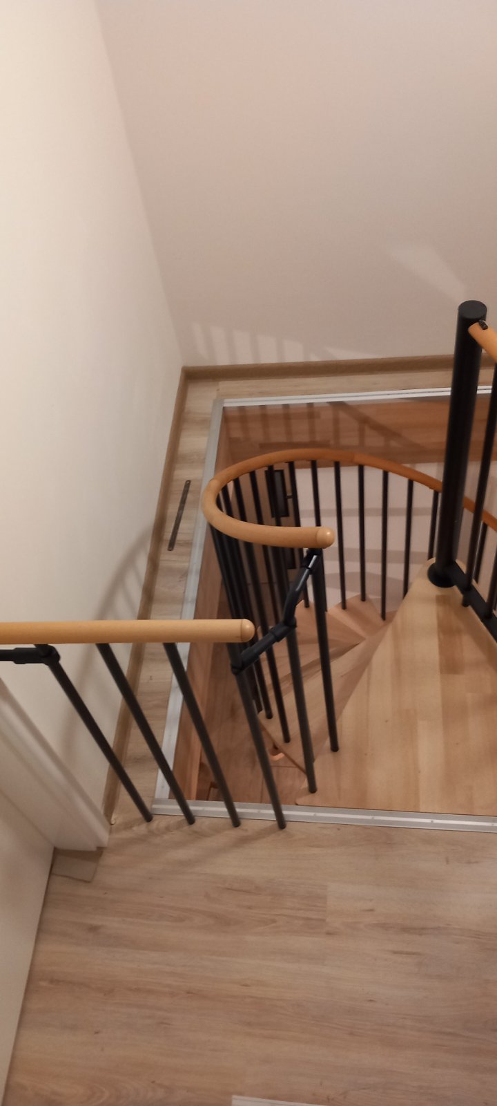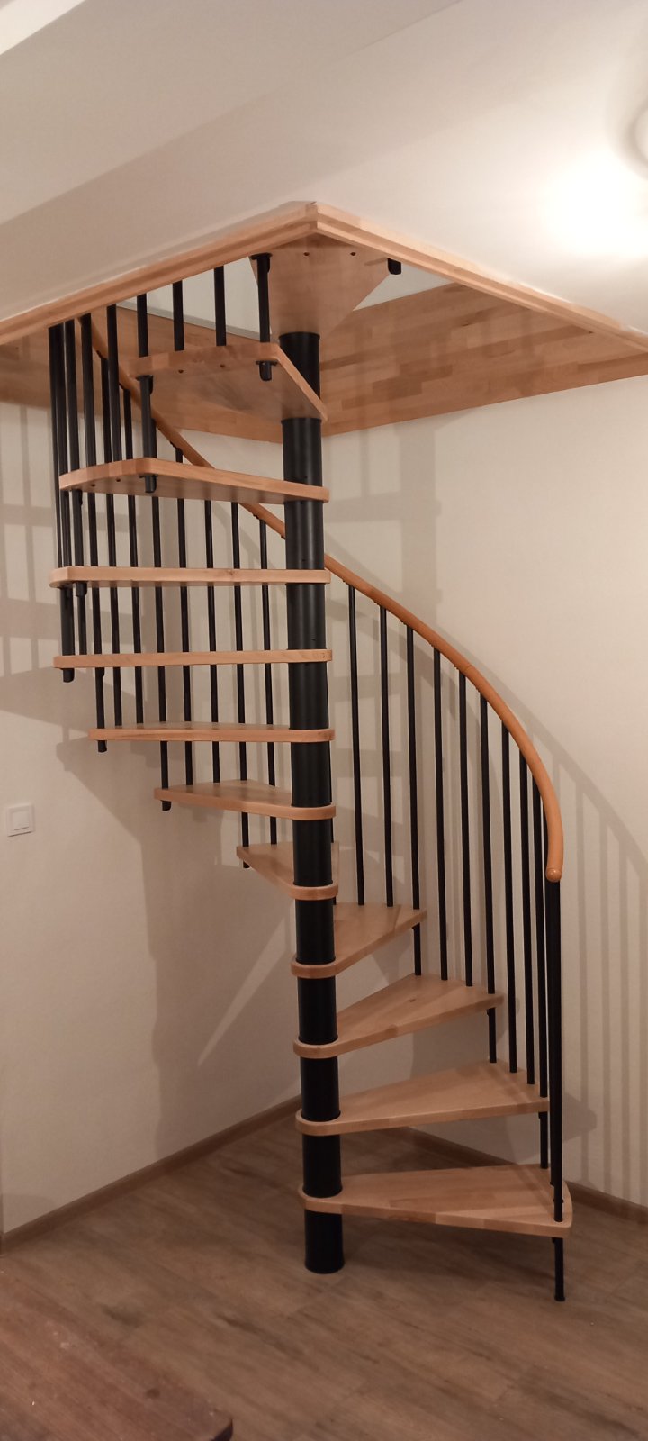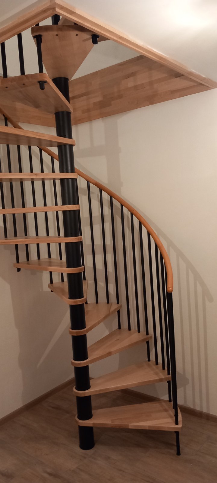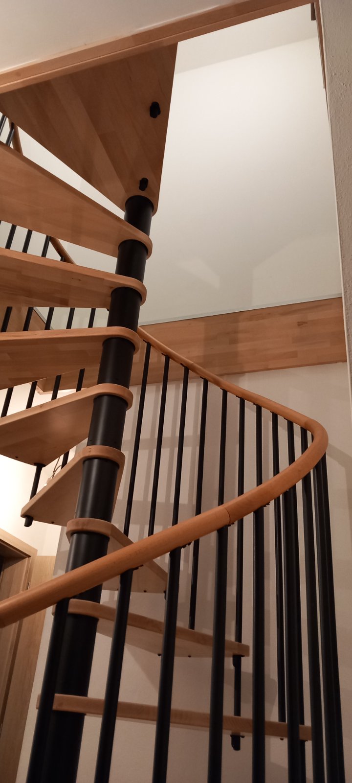 - Stabile Spindeltreppe mit Stufen und Handlauf aus lackiertem Massivholz