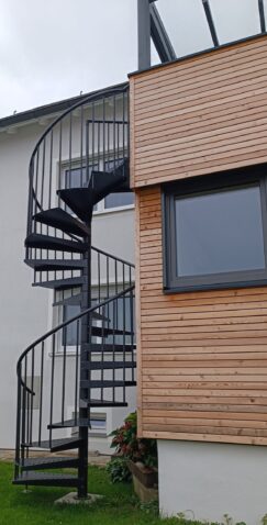 Celokovové vonkajšie točité schodisko s možnosťou výberu priemeru schodov, tvaru podesty a farby, stĺpové zábradlie s plastovým zábradlím.